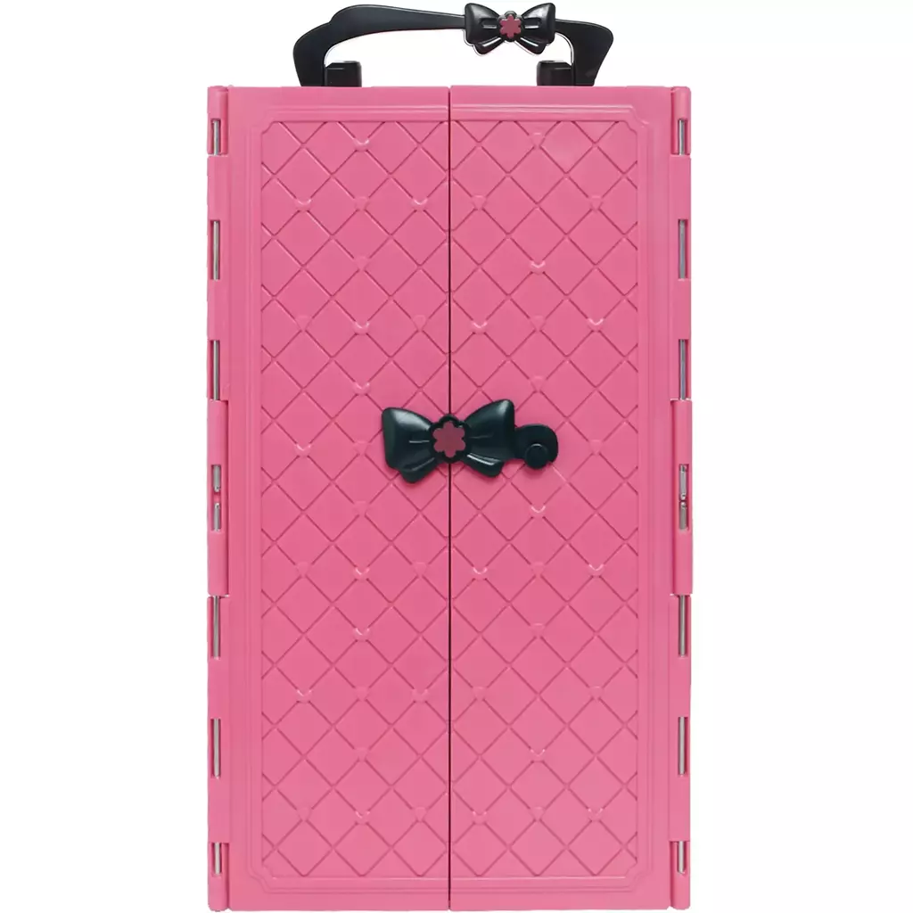 Disponível em cores vibrantes como rosa, vermelho e roxo, o guarda-roupa combina estilo e funcionalidade. O kit pode ser adquirido com 1 armário + 15 peças de roupas e acessórios (sapatos, bolsas e vestidos) ou apenas com o armário, de acordo com a sua preferência.